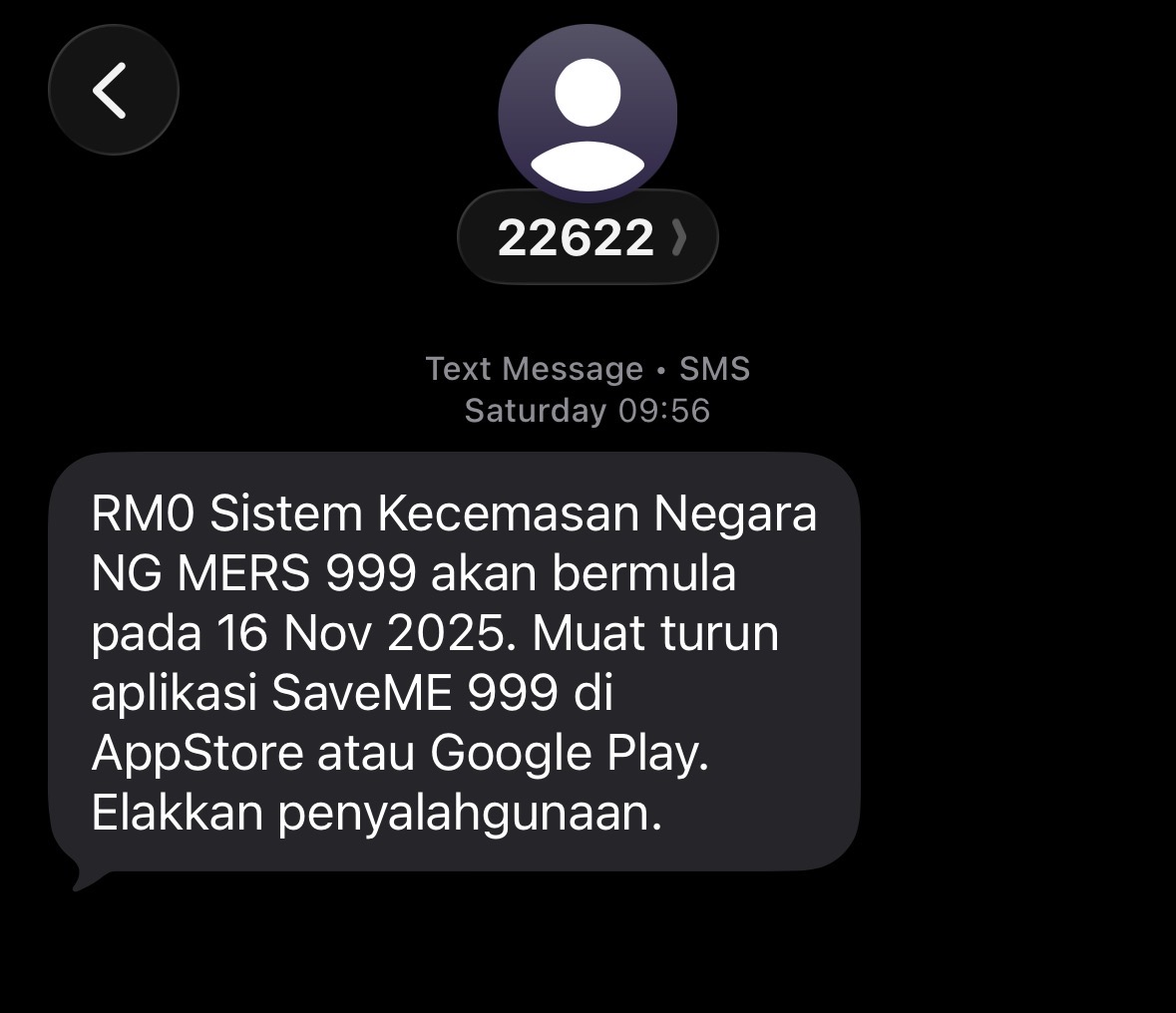 Kebanyakan pengguna mungkin sudah menerima SMS mengenai pelaksanaan Sistem Kecemasan Negara Next Generation Emergency Response Services 999 (NG MERS 999), yang mula beroperasi pada 16 November 2025 bagi menggantikan Malaysian Emergency Response Services 999 (MERS 999).