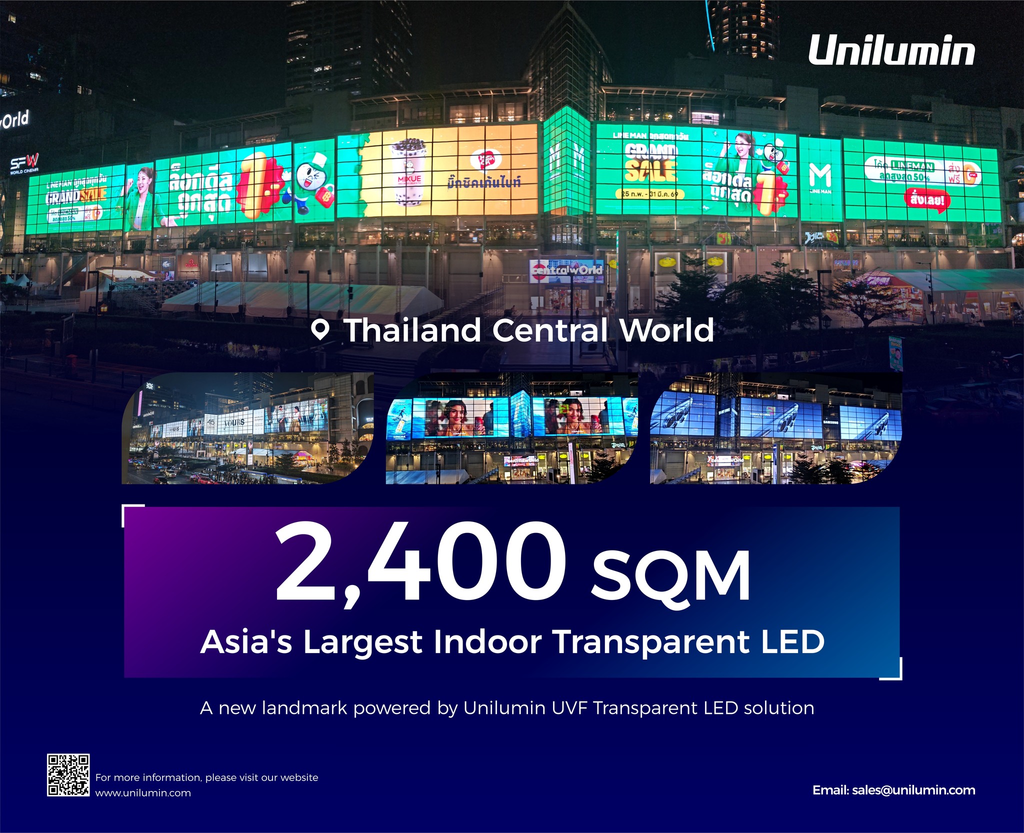 Projek mercu tanda skrin lutsinar dalaman terbesar di Asia telah disiapkan secara rasmi oleh Unilumin. Skrin lutsinar LED yang dipasang di Central World, Bangkok, Thailand meliputi kawasan seluas 2,400 meter persegi.