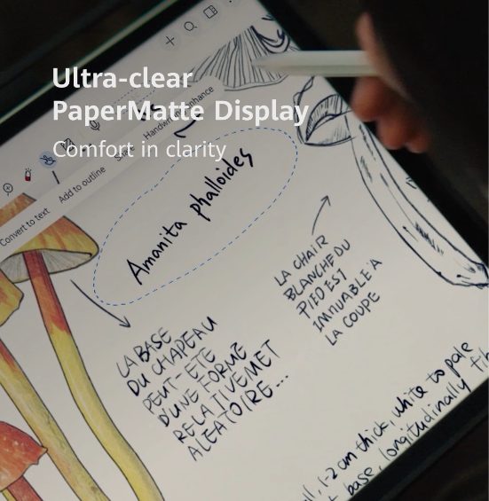 Pengalaman utama HUAWEI MatePad 12 X 2026 bermula dengan 12-inch Ultra-Clear PaperMatte Display. Paparan ini menggunakan teknologi nanoscale etching berketepatan tinggi yang mengurangkan kesan berkilau halus pada skrin sehingga 50 peratus, menghasilkan visual yang lebih smooth dan jelas.