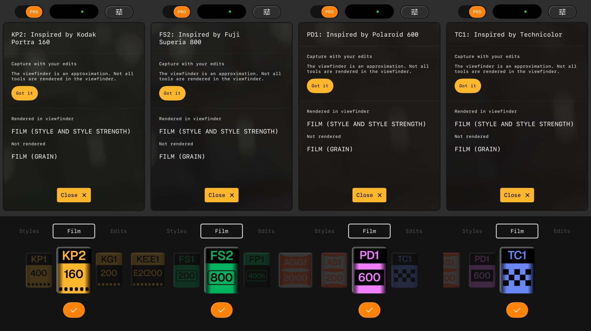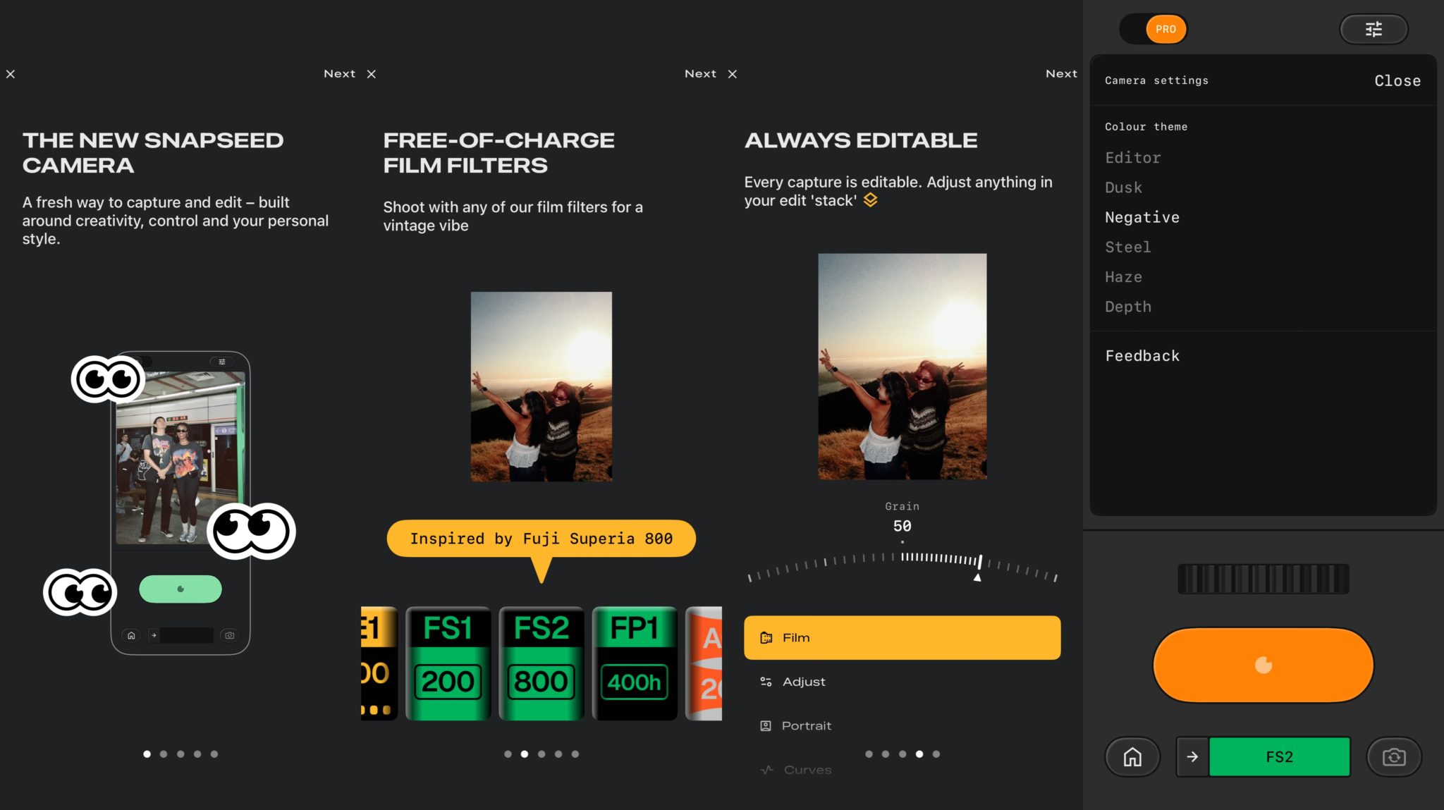 Terdapat juga pilihan tema warna untuk viewfinder, termasuk Editor, Dusk, Negative, Steel, Haze dan Depth, bagi menyesuaikan suasana semasa mengambil gambar.