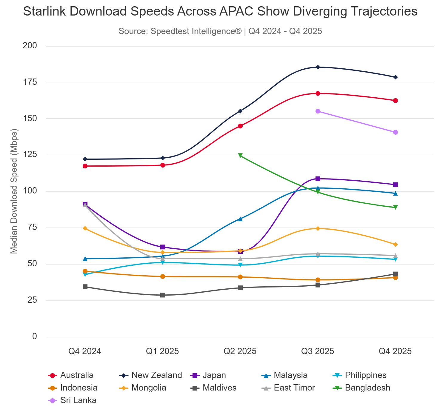 Di Asia Tenggara pula menunjukkan prestasi bercampur dengan kelajuan internet Starlink di Malaysia menunjukkan peningkatan hampir dua kali ganda — daripada 53.74 Mbps kepada 98.68 Mbps — apabila beban rangkaian berkurangan.