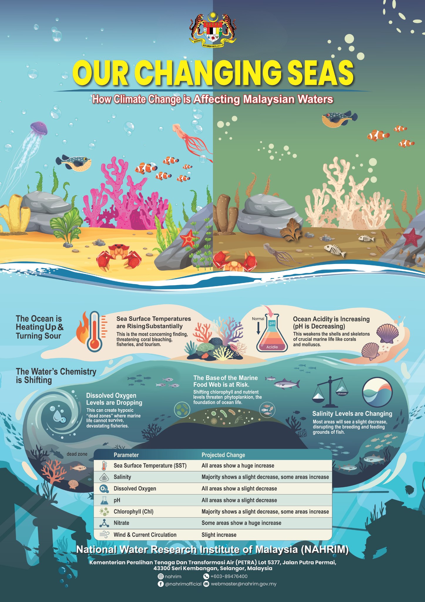 Unjuran NAHRIM menunjukkan suhu permukaan laut dan nitrat akan terus meningkat, manakala pH serta oksigen terlarut dijangka menurun.