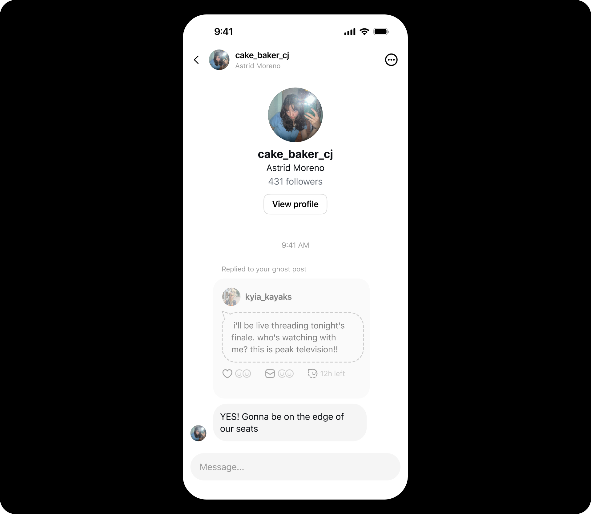 Ghost post dipaparkan sebagai gelembung sembang dengan latar belakang kelabu dalam suapan Threads, menjadikannya lebih menonjol berbanding siaran biasa.