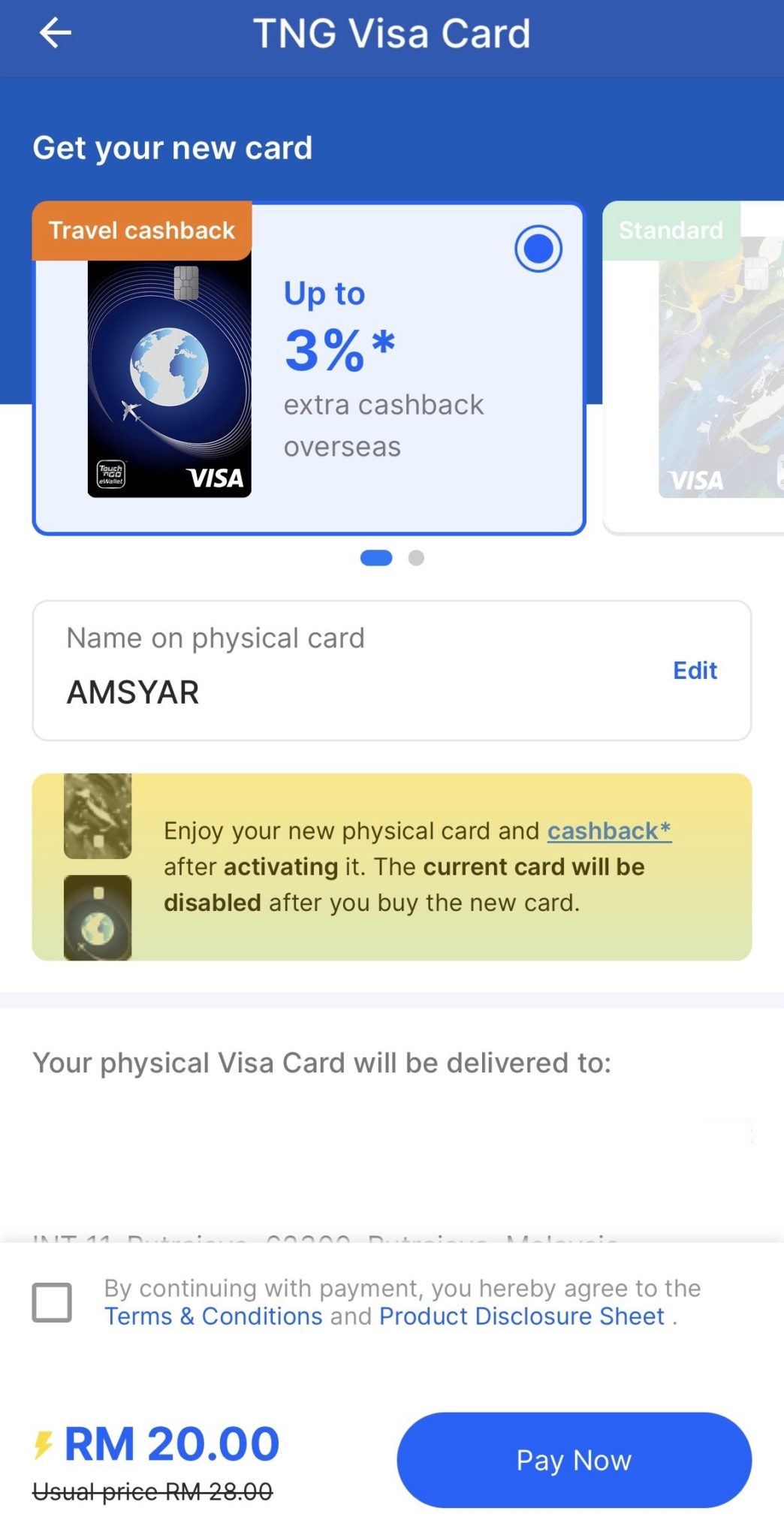 Bagi mereka yang berminat, kad ini boleh dimohon terus melalui aplikasi Touch ‘n Go eWallet di bahagian “Visa Card”. Selepas pembayaran dibuat, kad fizikal akan dihantar terus ke alamat pengguna dan perlu diaktifkan sebelum digunakan.