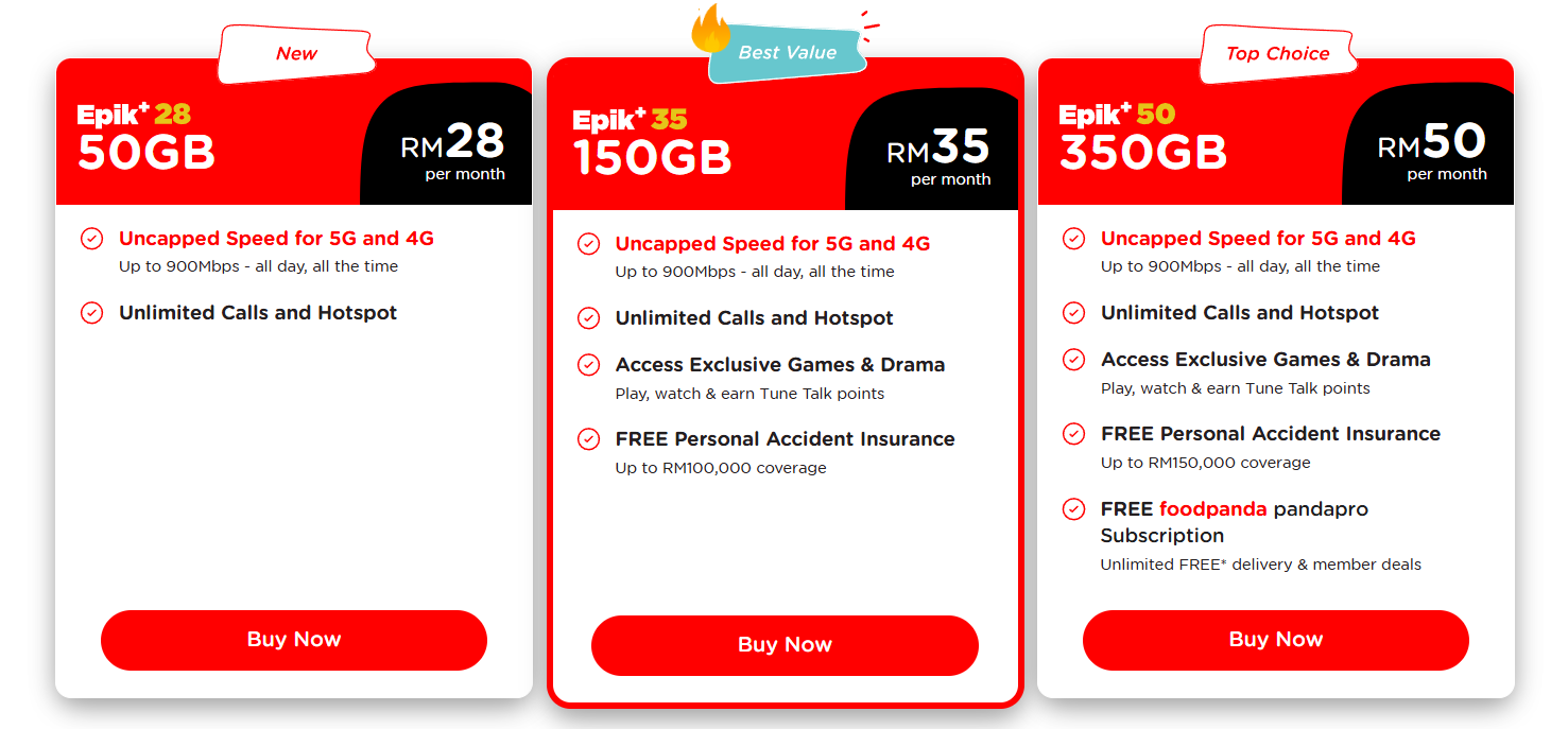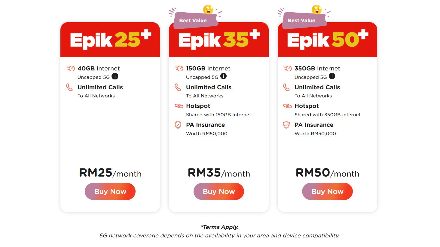 Sementara itu, pelan Epik+ 50 yang menawarkan 350GB data kini dinaik taraf dengan insurans kemalangan peribadi sehingga RM150,000, serta langganan percuma foodpanda pandapro yang merangkumi penghantaran percuma dan tawaran eksklusif ahli.