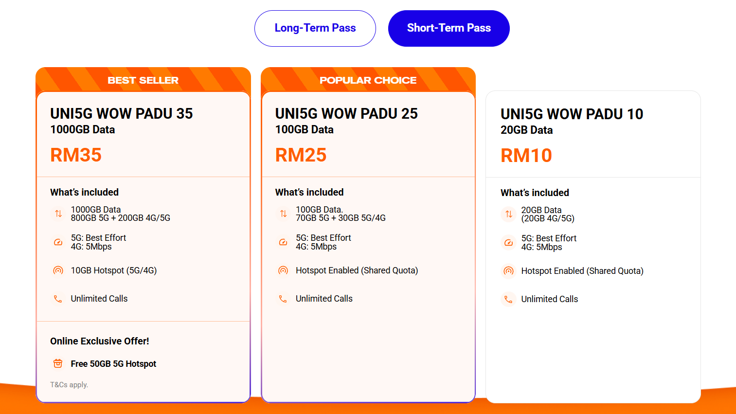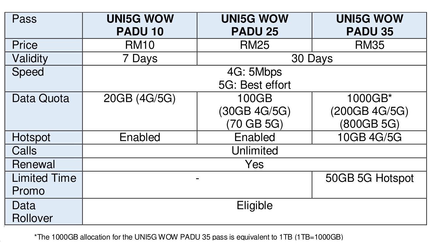 Pas UNI5G WOW PADU 35 berharga RM35/bulan kini menawarkan 1000GB (1TB) data, iaitu 200GB untuk 4G/5G dan 800GB untuk 5G, bersama hotspot 10GB 4G/5G dan panggilan tanpa had. Untuk promosi terhad, pengguna turut menerima 50GB 5G hotspot percuma.