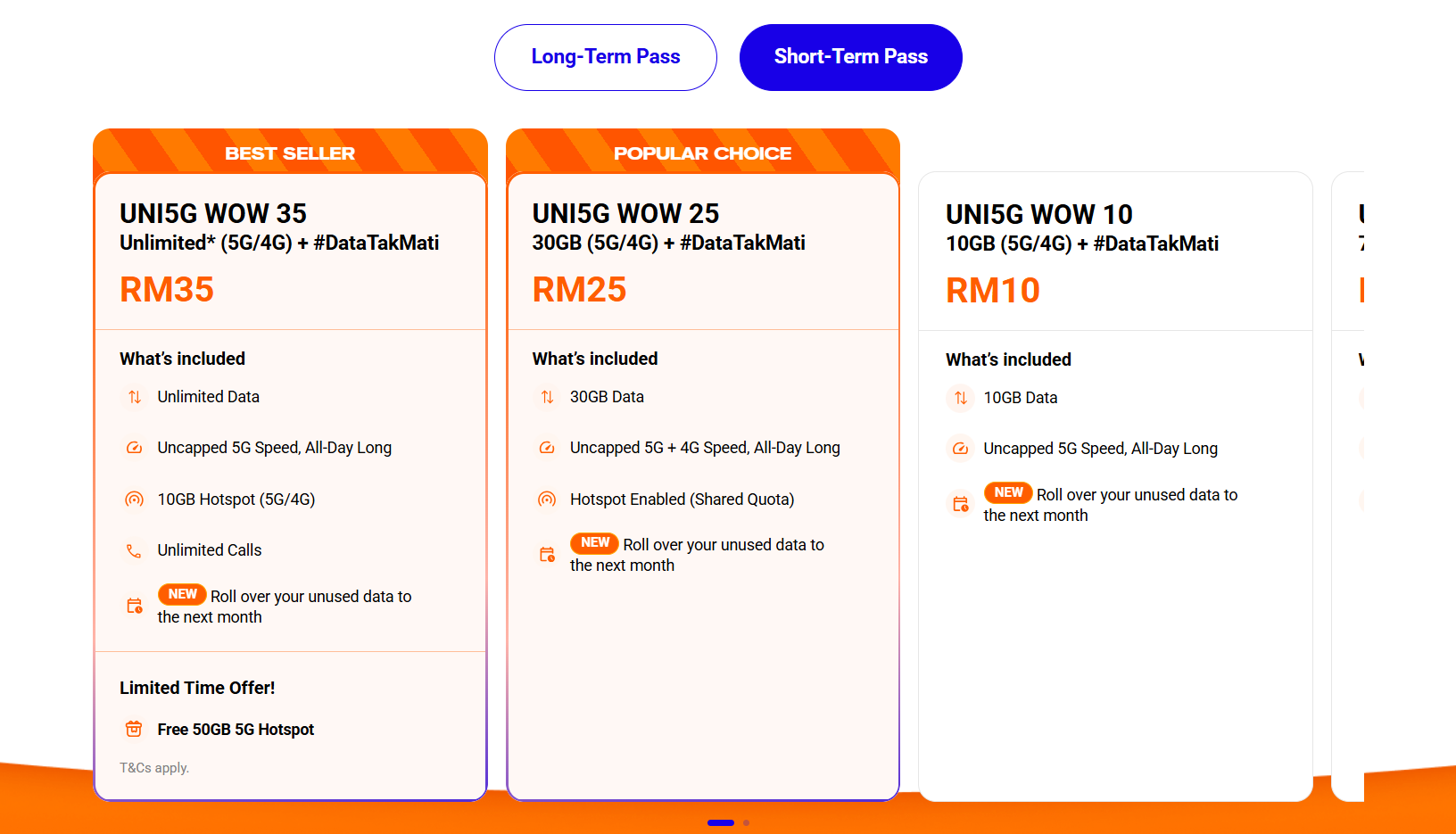 Kesemua pas ini juga membolehkan pengguna membawa kuota data (data rollover) yang tidak digunakan ke minggu atau bulan berikutnya, tetapi perlu diperbaharui sebelum tarikh luput. Dari segi kelajuan, 4G ditawarkan sehingga 5Mbps manakala 5G dikategorikan sebagai ‘best effort’.