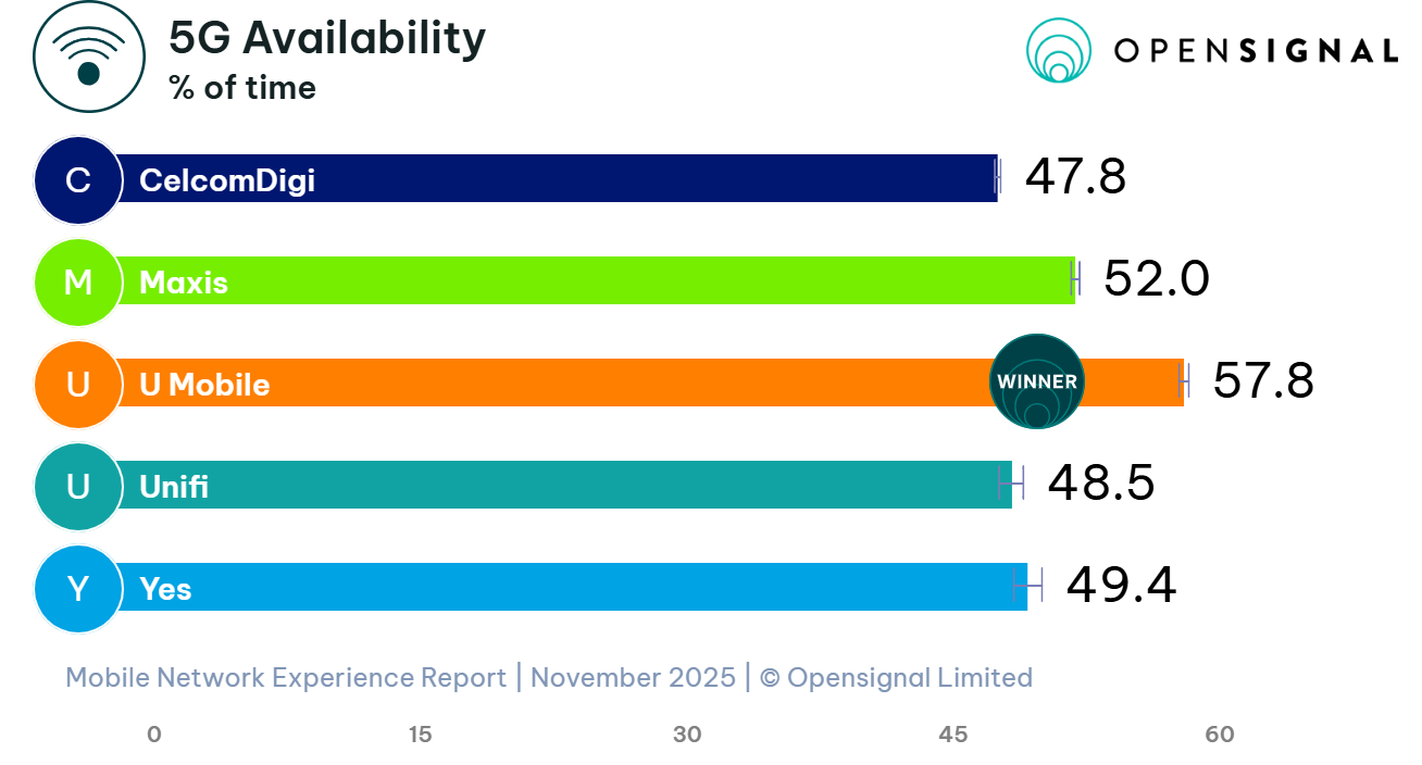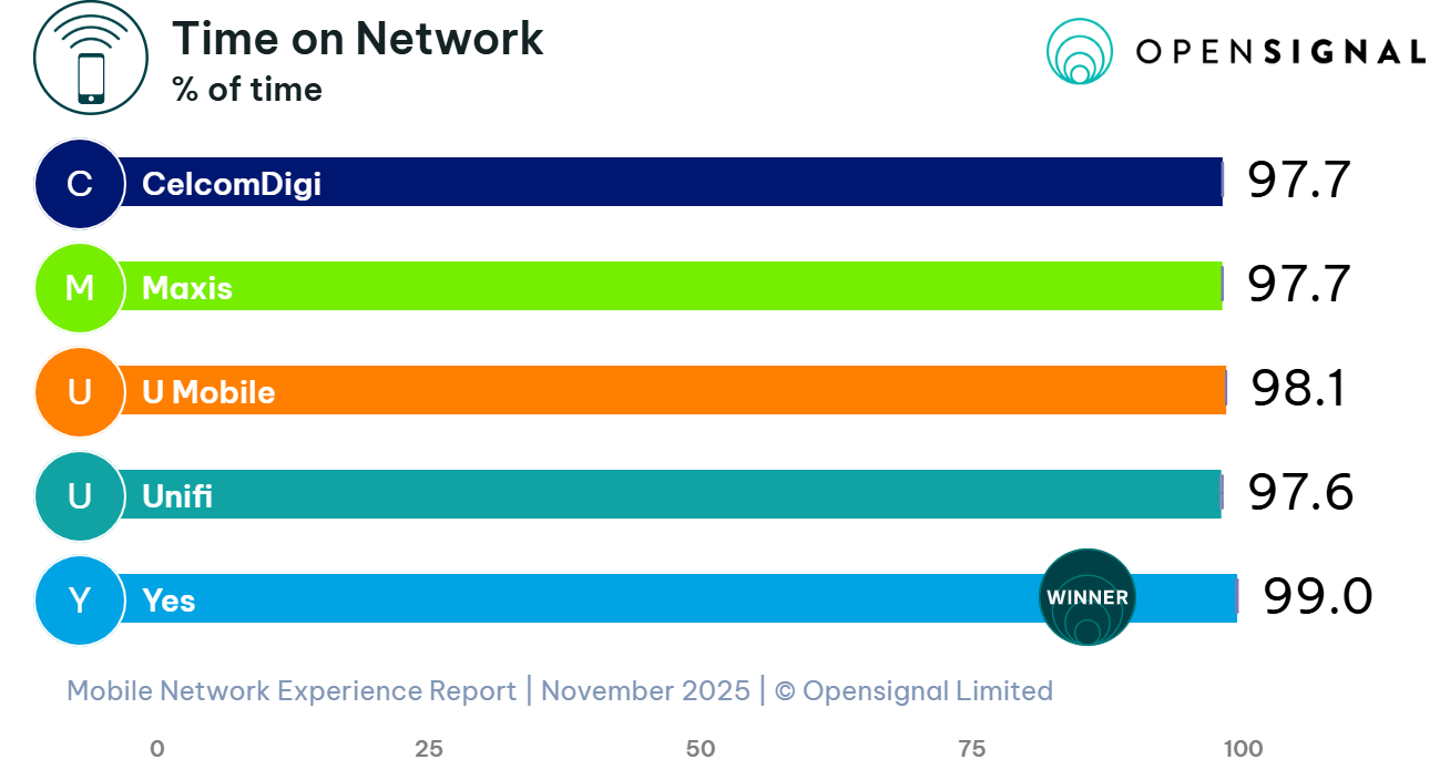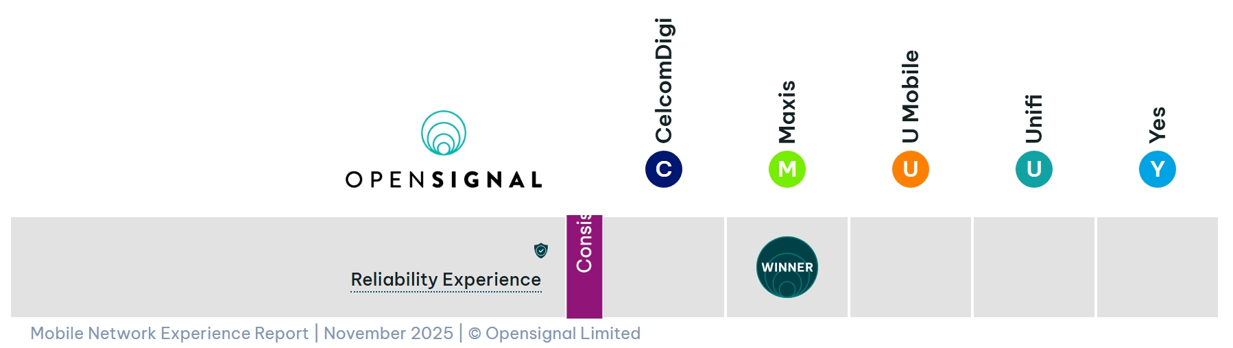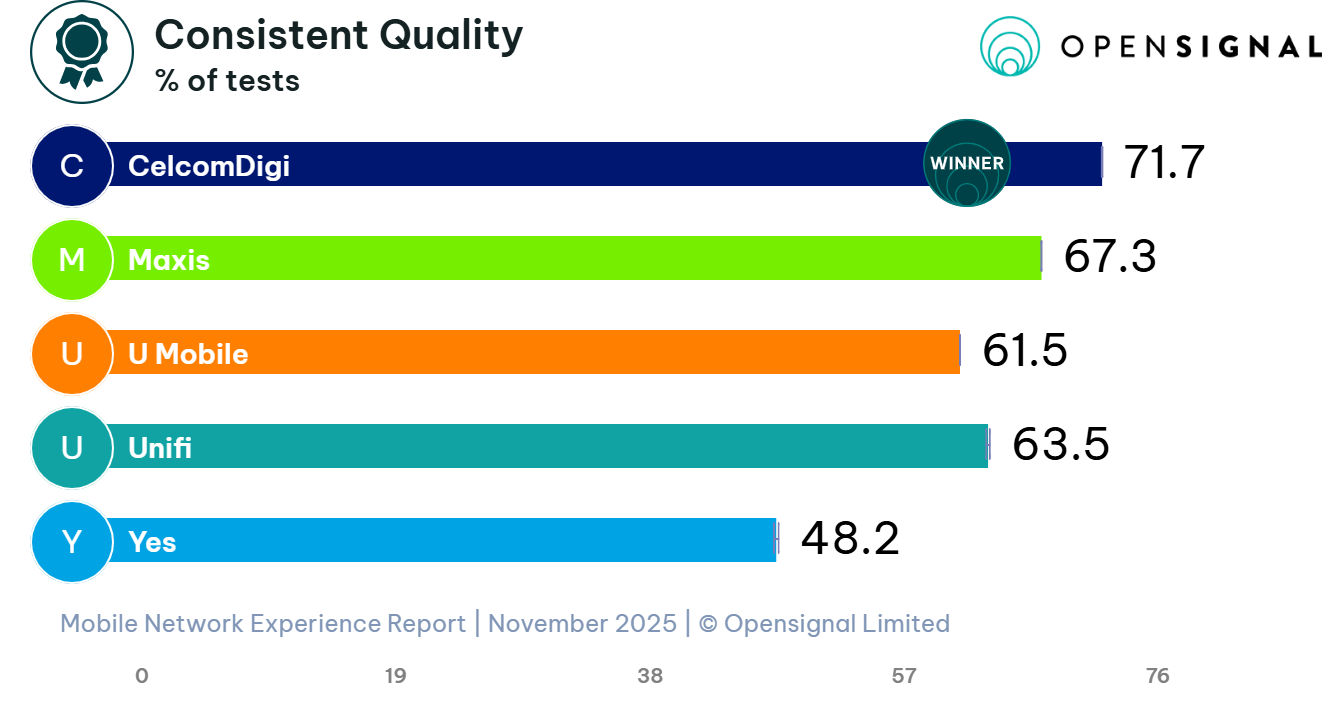 Laporan Opensignal November 2025 menunjukkan persaingan sengit antara lima penyedia rangkaian mudah alih utama di Malaysia iaitu CelcomDigi, Maxis, U Mobile, Unifi dan Yes.
