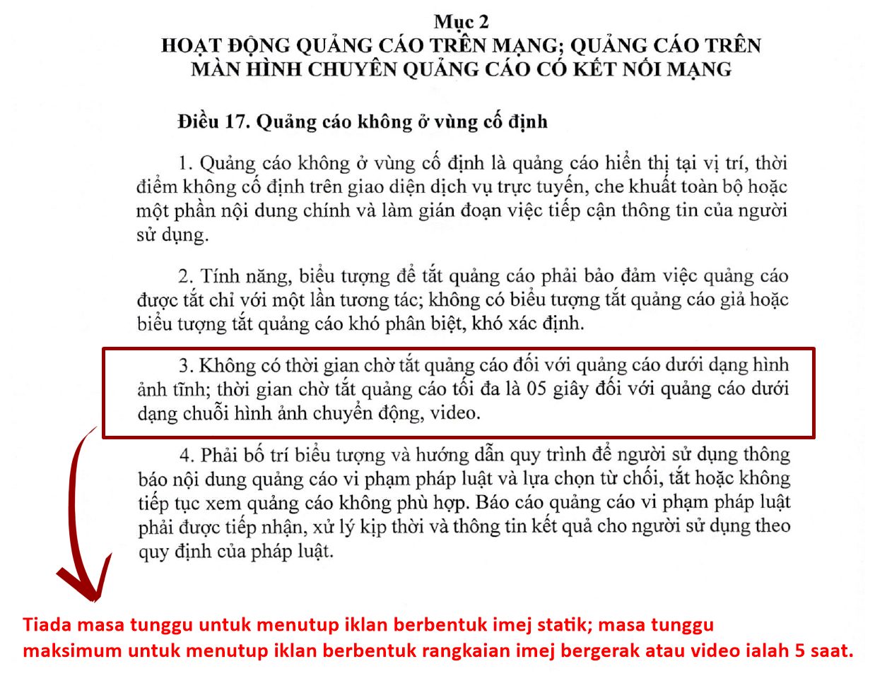 Peraturan ini menetapkan masa menunggu maksimum 5 saat bagi iklan video dan urutan imej bergerak. Ini bermakna, platform dalam talian di Vietnam tidak dibenarkan memaksa penonton menunggu lebih daripada 5 saat sebelum iklan berbentuk video boleh ditutup atau dilangkau (skip).