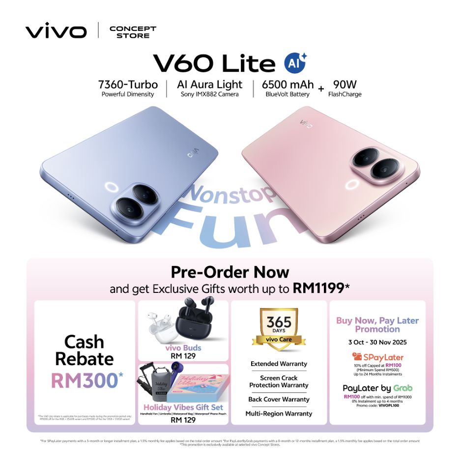 Pembeli turut menerima Holiday Vibes Gift Set, rebat sehingga RM300, dan pelan ansuran tanpa faedah 0%, menjadikannya lebih mudah untuk memiliki vivo V60 Lite 5G.