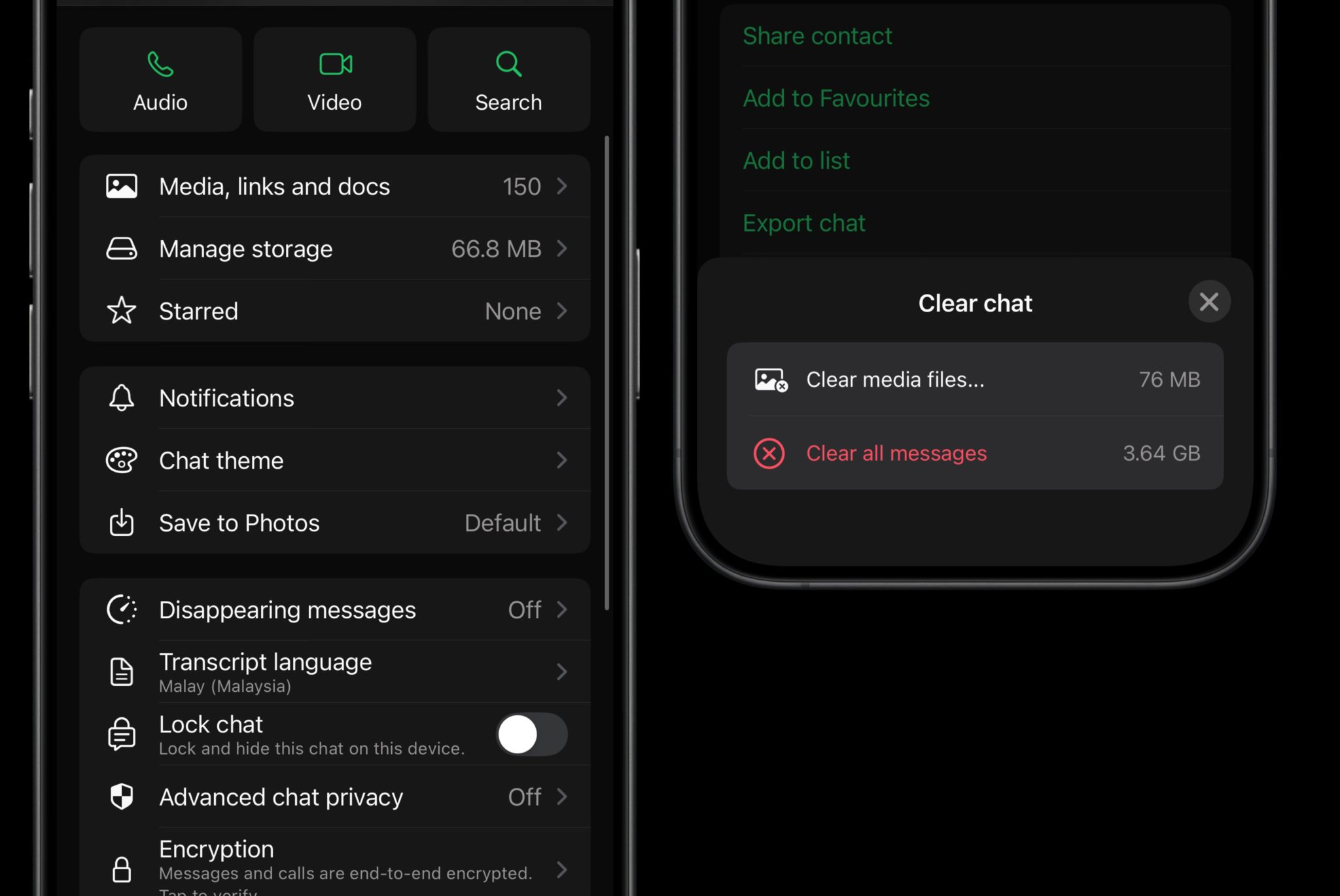 Selain itu, di bahagian “Clear Chat” kini terdapat pilihan “Clear media files..” untuk mengosongkan fail media sahaja, dan mengekalkan sejarah sembang.