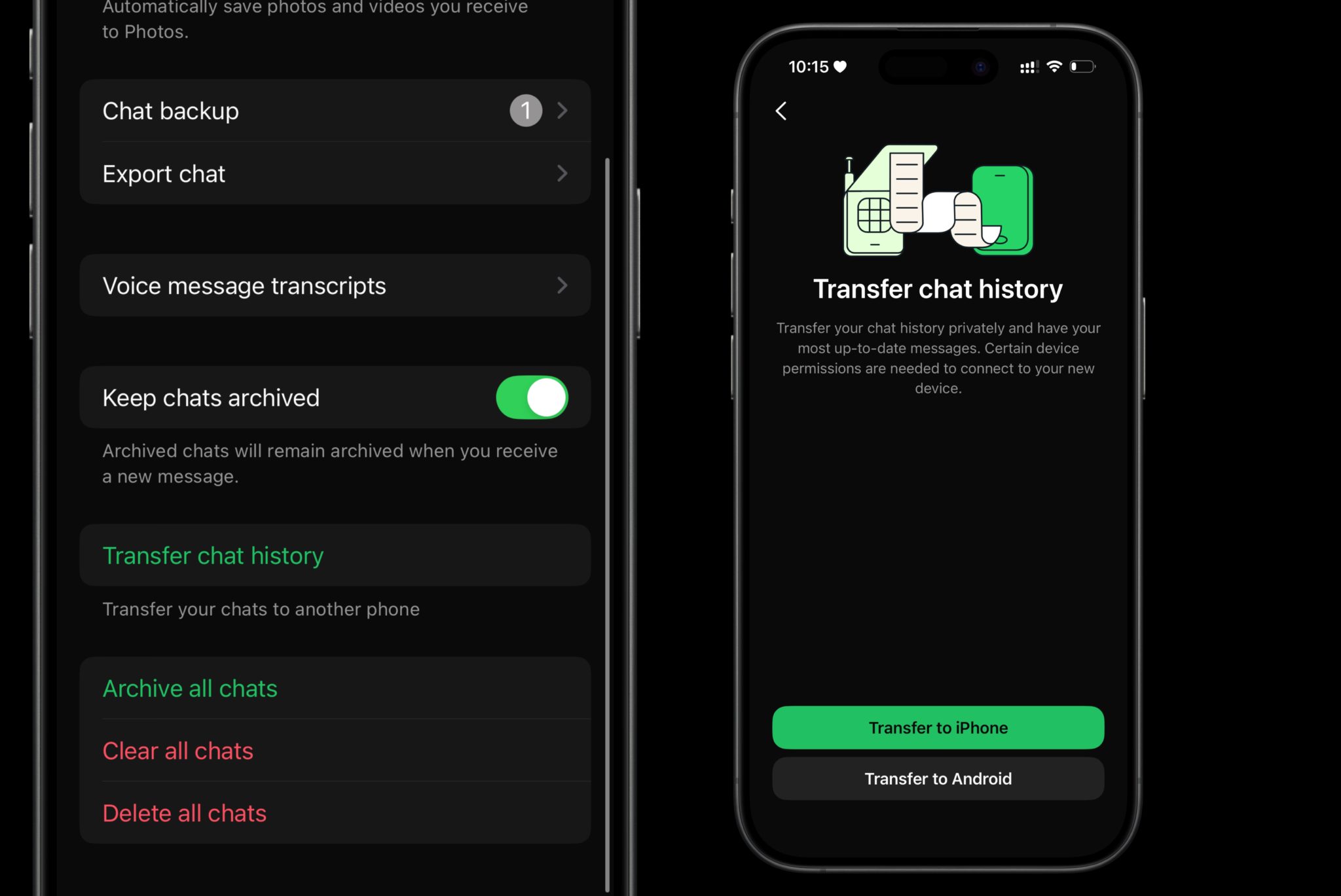 Ciri pemindahan sembang (chat transfer) kini menyokong peralihan sejarah sembang daripada iOS kepada Android, selain pemindahan dalam platform yang sama. Ciri ini boleh diakses melalui Settings > Chat > Transfer chat history.