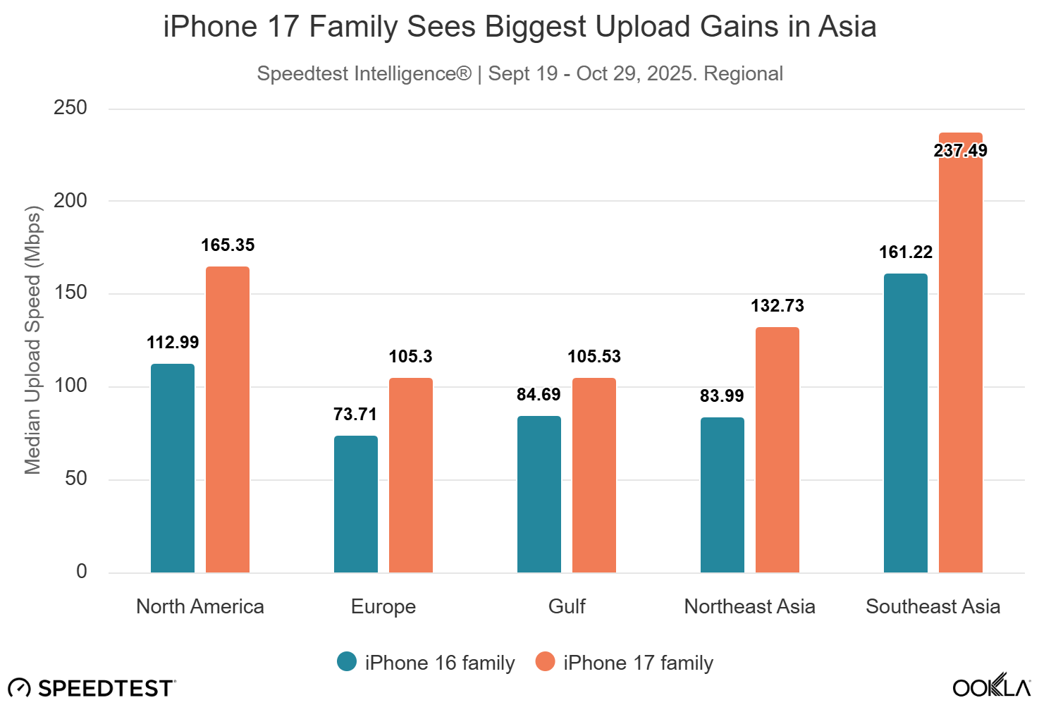 Malah, kelajuan muat naik menerusi iPhone 17 turut melonjak di Asia.