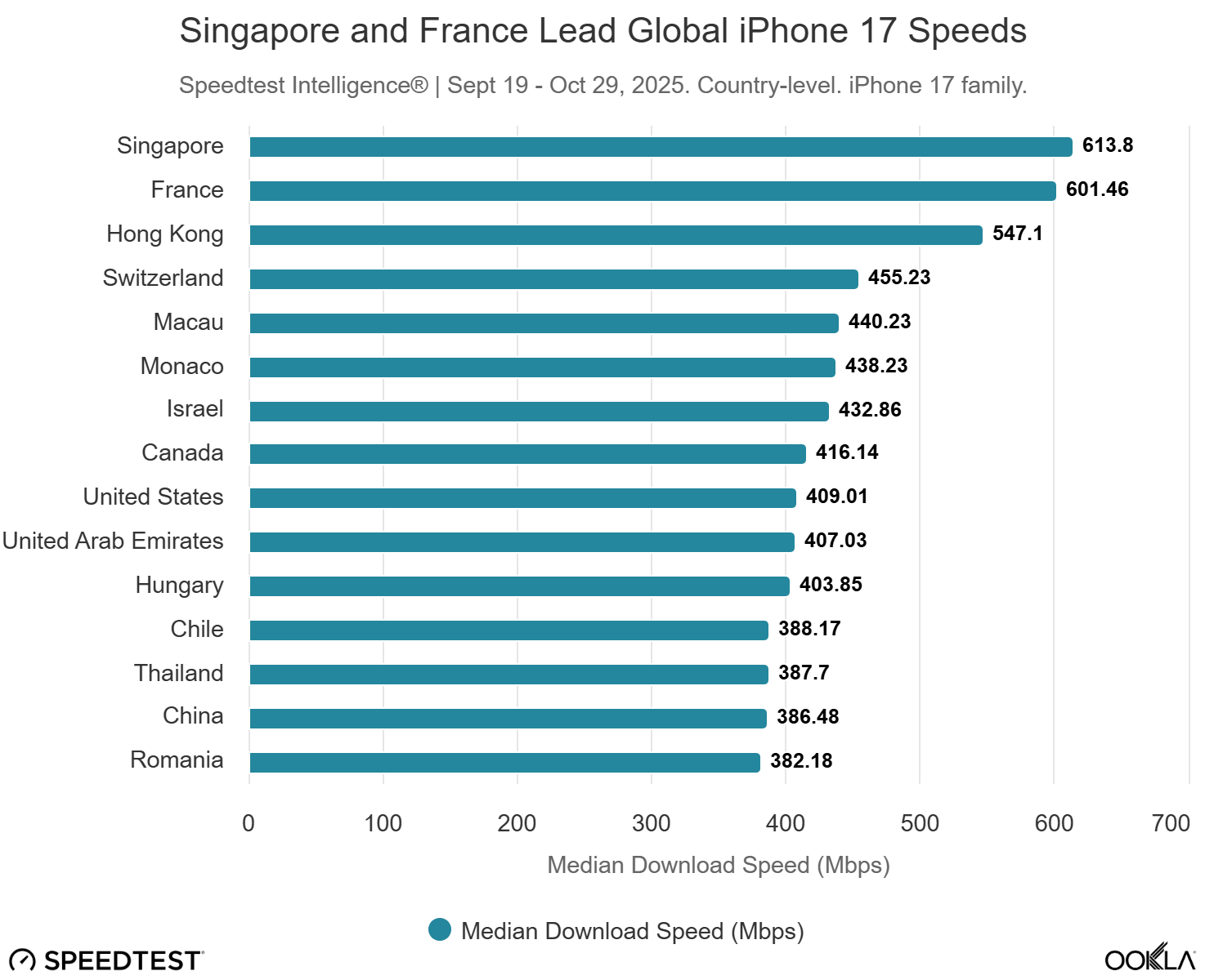 Menurut data Speedtest Intelligence, iPhone 17 mencatat kelajuan muat turun median tertinggi 416.14 Mbps, hampir 40% lebih pantas berbanding iPhone 16.