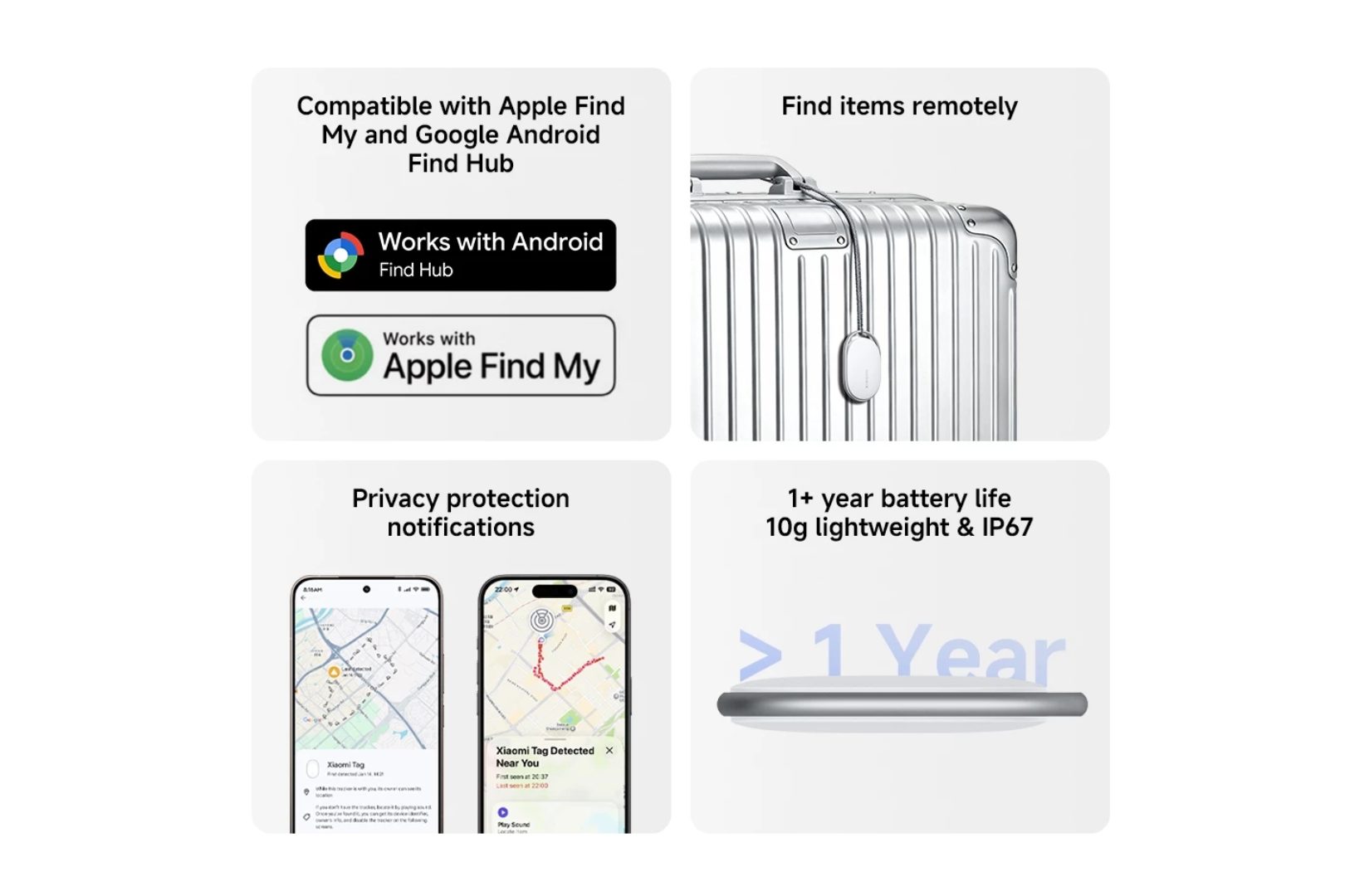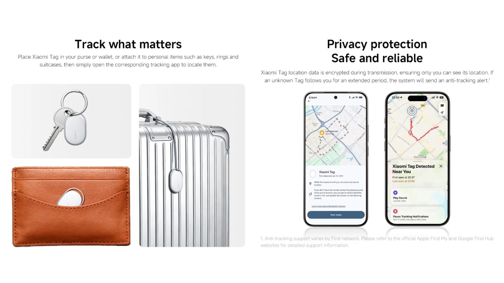 Xiaomi Tag menyokong Google Find Hub untuk peranti Android 9 ke atas dan Apple Find My untuk iPhone/iPad dengan iOS 14.5 atau iPadOS 14.5 ke atas, menjadikannya serasi dengan pelbagai telefon pintar dan tablet.