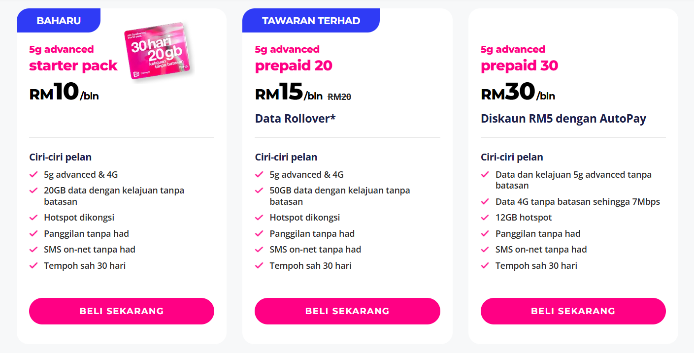 Sementara itu, 5g advanced prepaid 30 pada RM30/bulan memberikan data dan kelajuan 5G Advanced tanpa had, data 4G tanpa had sehingga 7Mbps, dan 12GB hotspot.